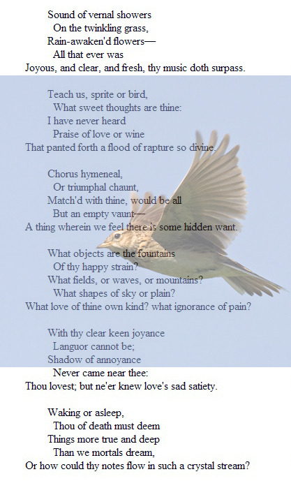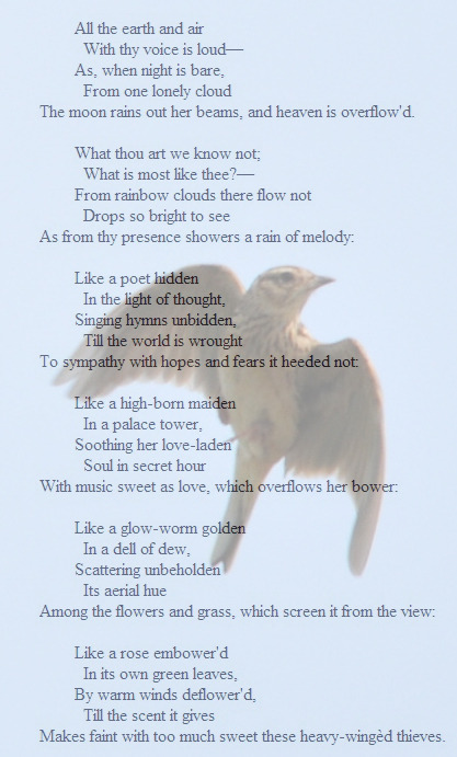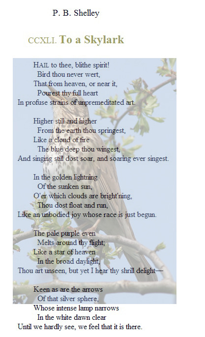 땅에서 그대는 솟아올라 마치 불타는 듯한 구름 같아라. 푸른 하늘을 그대는 날며 노래하고 계속 올라가고 또 올라가며 끝 없이 노래하도다.