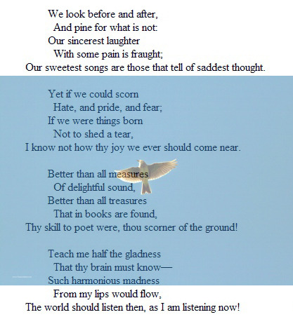 그대는 반짝이는 풀 위 비에 눈을 뜨는 꽃 위에 쏟아지는 봄 소나기 소리이며 일찍이 존재한 즐겁고 맑고 신선한 모든 것들을 그대 가락은 능가하도다.