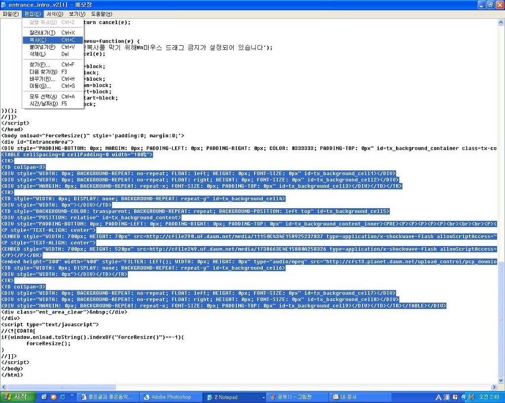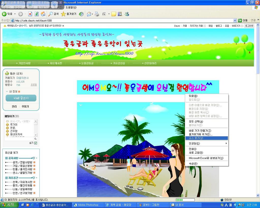 그런다음 우측 마우스를 클릭 하시면 소스보기의 창이 나타 납니다.