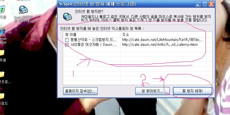 오른쪽 마우스버튼 펌 방지를 풀어주는 프로그램 입니다. 익스플로러를 실행한 상태에서 프로그램을 실행시키면 창이 뜨는데, 네모박스에 체크표시를 한 후 펌 방지 해제! 를 클릭하면 해당 홈페이지의 마우스 오른쪽 클릭 방지나 마우스 드래그 금지 등과 같은 펌방지가 해제되게 됩니다.