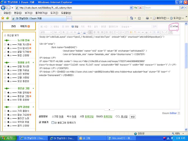 이때 반드시 HTML을 선택하시고 글쓰기 공간안을 마우스로 선택한 후에 붙여넣기를 하면됩니다.