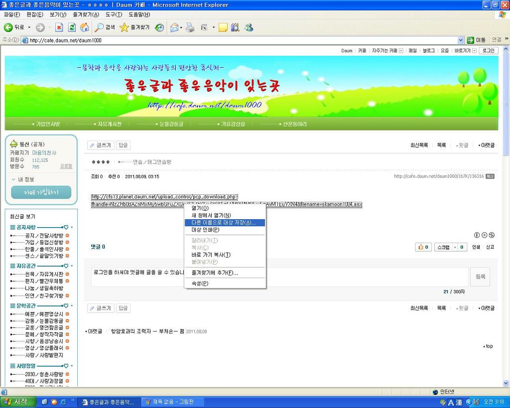 다시 들어가신후...주소창위에서 우측클릭....다른 이름으로 대상저장...^^