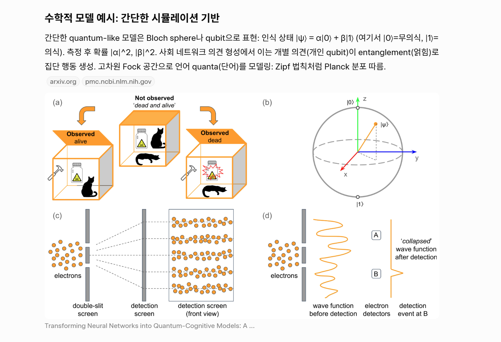 간단한 quantum-like 모델은 Bloch sphere나 qubit으로 표현: 인식 상태 |ψ⟩ = α|0⟩ + β|1⟩ (여기서 |0⟩=무의식, |1⟩=의식). 측정 후 확률 |α|^2, |β|^2. 사회 네트워크 의견 형성에서 이는 개별 의견(개인 qubit)이 entanglement(얽힘)로 집단 행동 생성. 고차원 Fock 공간으로 언어 quanta(단어)를 모델링: Zipf 법칙처럼 Planck 분포 따름.